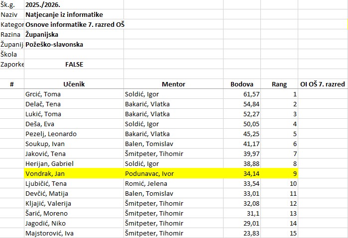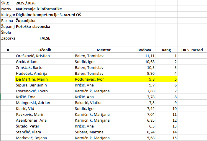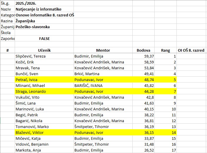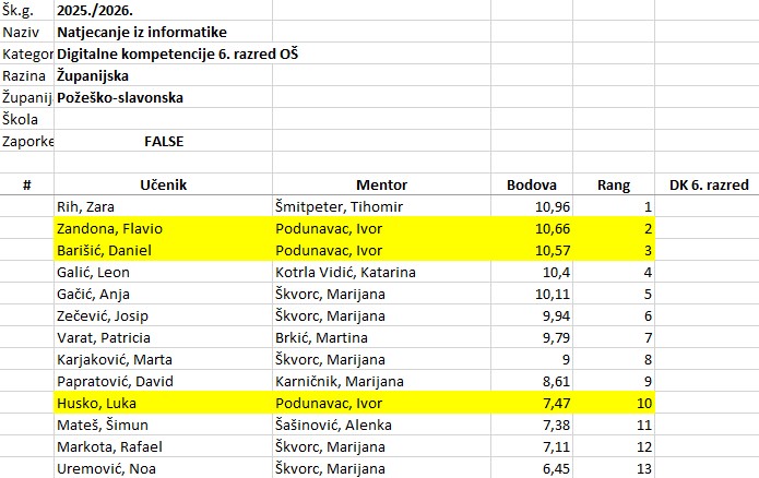 U petak, 13.2., u Tehničkoj školi u Požegi održano je županijsko natjecanje iz Informatike. Svih osam učenika su se nakon školskog natjecanja uspjeli plasirati na županijsko. Najbolje rezultate ostvarili su Flavio Zandona (2. mjesto) i Daniel Barišić (3. mjesto) u kategoriji Digitalne kompetencije – 6. razred.
